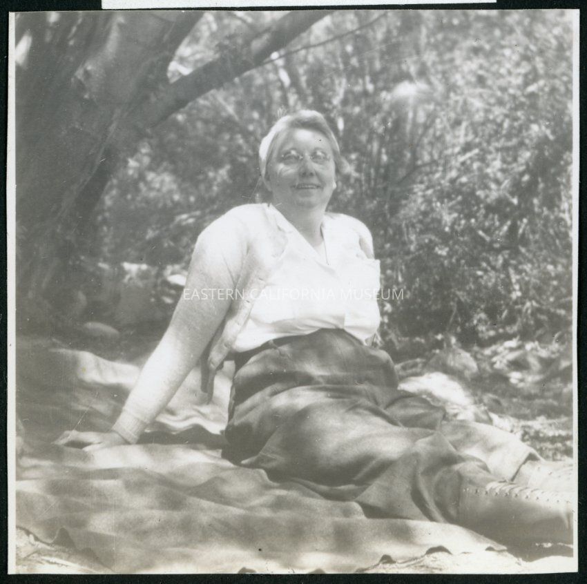 Photograph of Edna Anderson sitting on a picnic blanket near Manzanar Incarceration Camp at a hospital staff picnic.Collection
