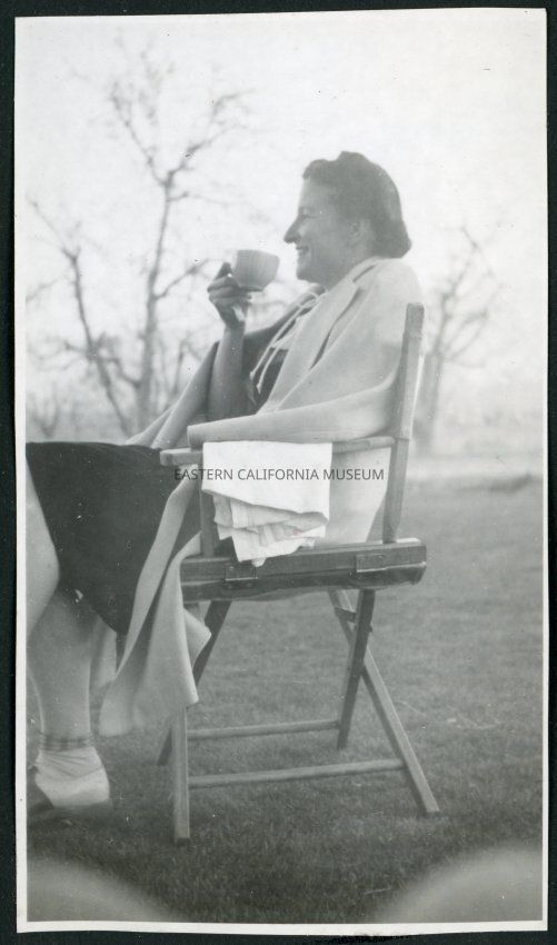 Photograph of a women enjoying a cup of tea in a camp chair on a lawn at Manzanar Incarceration Camp.Collection