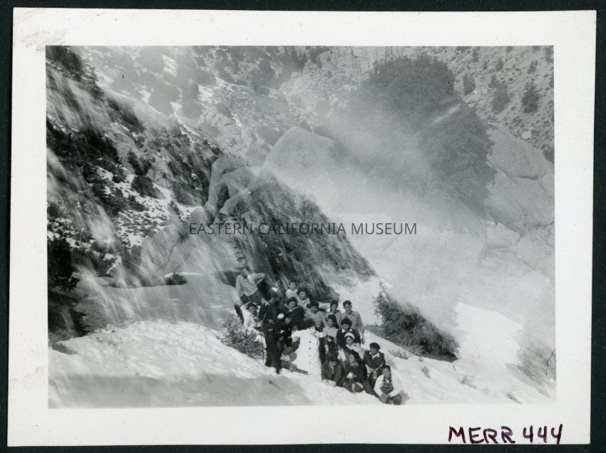 Photograph of a group of people holding snow balls on the side of a mountain with a snowman near the Manzanar Incarceration Camp.Collection