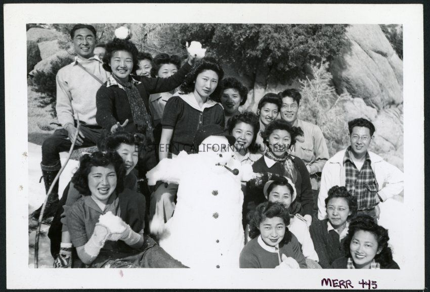 Photograph of a group of people holding snow balls on the side of a mountain with a snowman near the Manzanar Incarceration Camp.Collection
