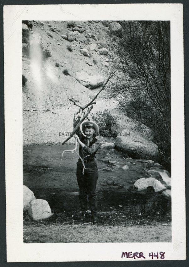 Photograph of Bernice Sibner holding a branch over her head next to a stream in the Sierra Nevada near Manzanar Incarceration CampCollection