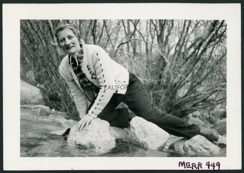 Photograph of a women leaning on a number of rocks in a stream in the Sierra Nevada near the Manzanar Incarceration Camp. She is wearing a cardigan, plaid shirt, and jeans.Collection