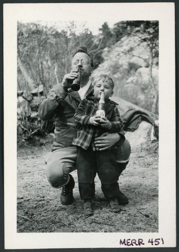 Photograph of Morse Little and his son, both dirinking from bottles, near the Manzanar Incarceration Camp at a hospital staff picnic.Collection