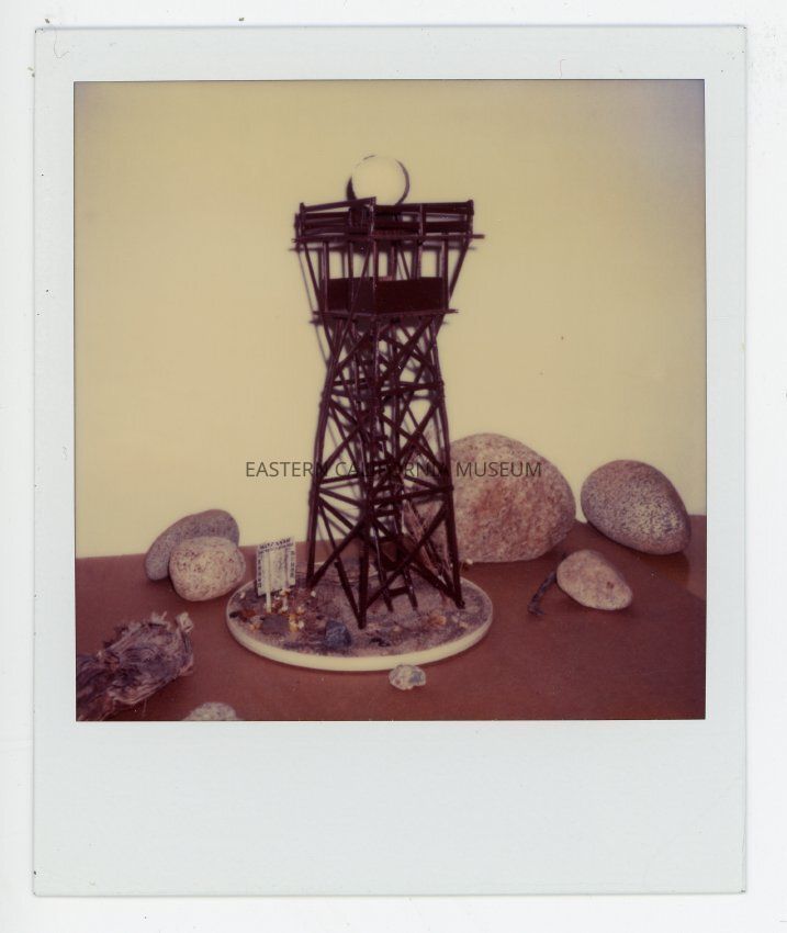 Color Polaroid photo of a model guard tower at Manzanar War Relocation Center.