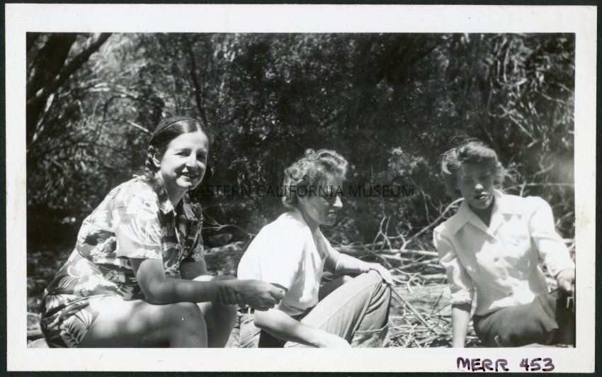 Photograph of Irene Gavigan, L. Josephine Hawes and Eleanor Thomas sitting in front of a stand of trees near the Manzanar Incarceration Camp at a hospital staff picnic.Collection