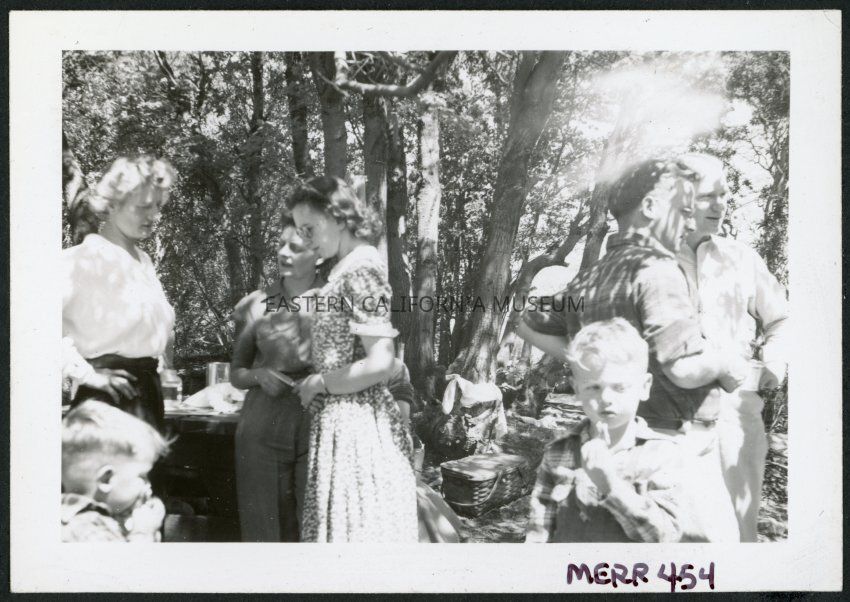 Photograph of a group of people near the Manzanar Incarceration Camp at a hospital staff picnic. There are three women, two children and two men in the photograph. In the background is a picnic basket and trees.Collection