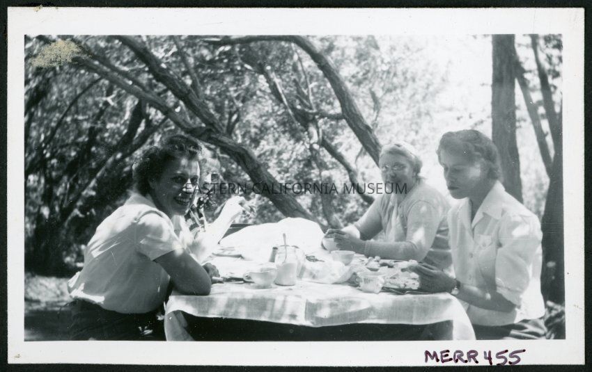Photograph of L. Josephine Hawes, Edna Anderson, Eleanor Thomas and unidentified woman, sitting at a picnic table near the Manzanar Incarceration Camp at a hospital staff picnic.Collection