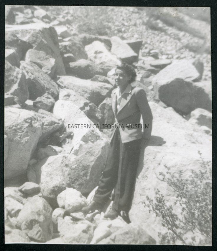 Photograph of a women leaning against a boulder in a rock field near the Manzanar Incarceration Camp.Collection