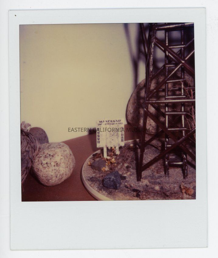 Color Polaroid photo of the details on a model guard tower at Manzanar War Relocation Center.