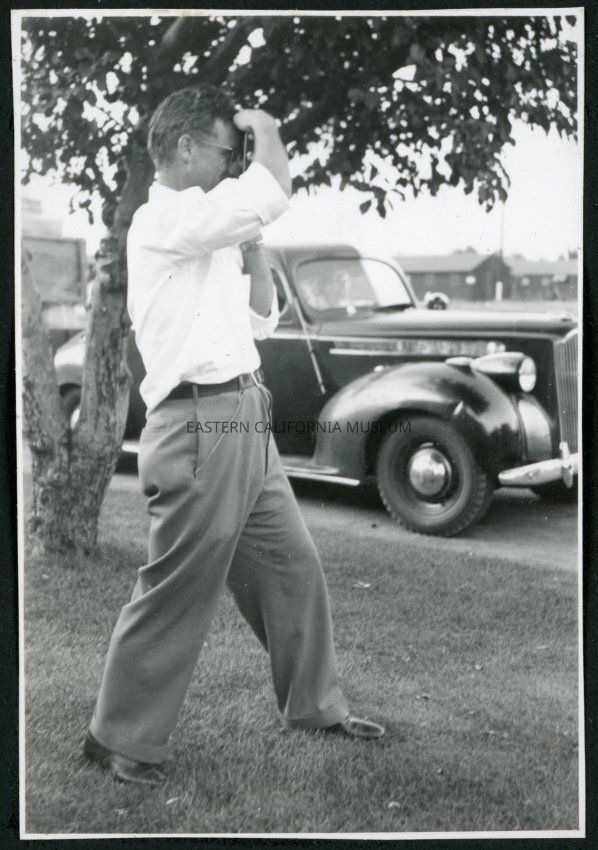 Photograph of Dr. Morse Little holding a camera with a car and trailer in the background at Manzanar Incarceration Camp. The trailer is full of their belongings as they are preparing to depart.Collection
