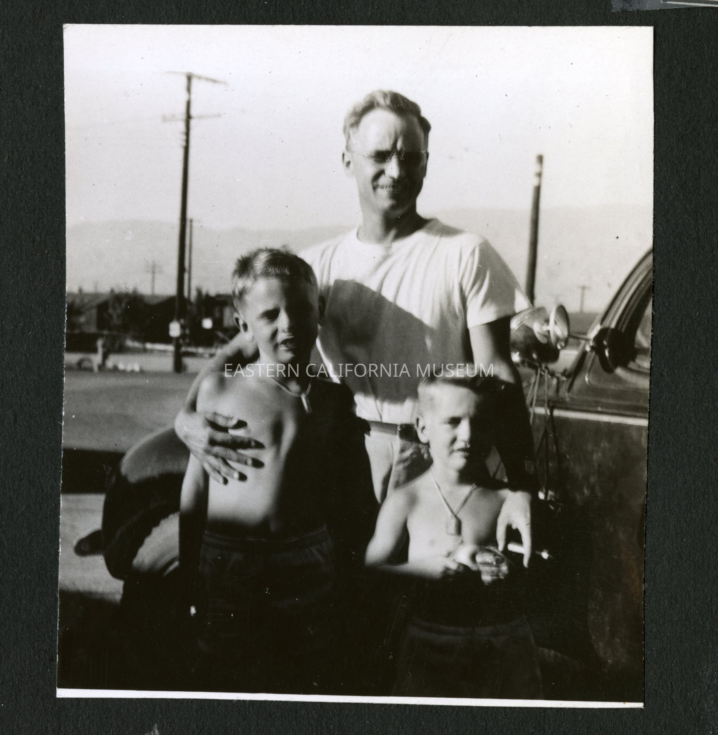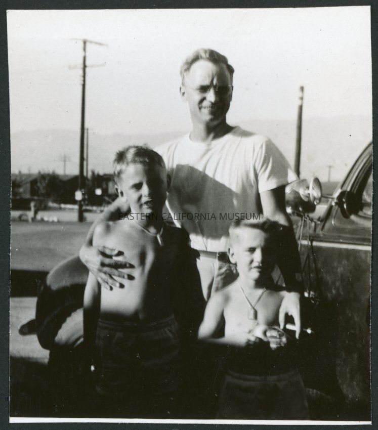 Photograph of Dr. Morse Little and his two sons as they are getting ready to depart Manzanar Incarceration Camp. Behind them is a car, utility pole, several buildings and the Inyo mountains.Collection
