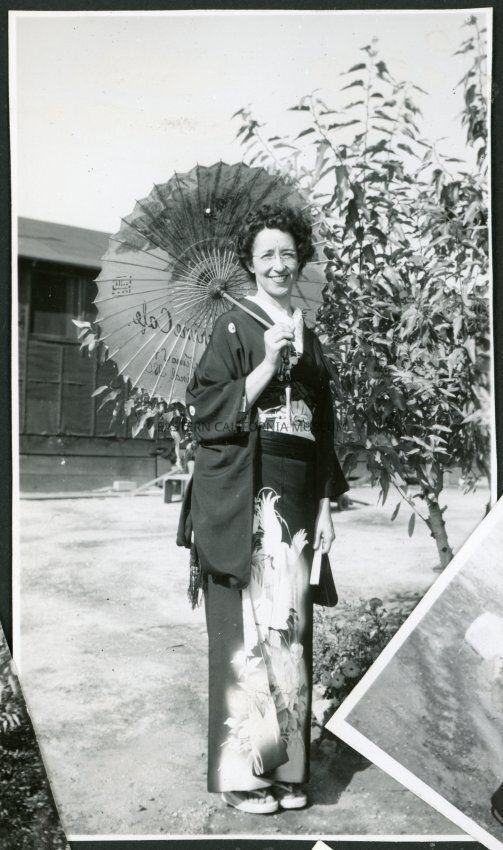 Photograph of Thelma McBride, full-length, facing slightly away from the camera, holding a parasol over her right shoulder. A Manzanar hospital building can be seen in the background.Collection