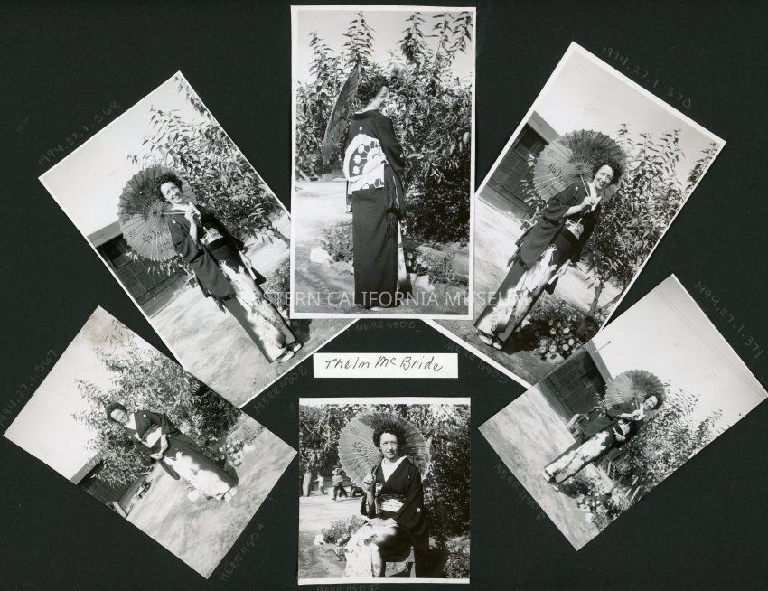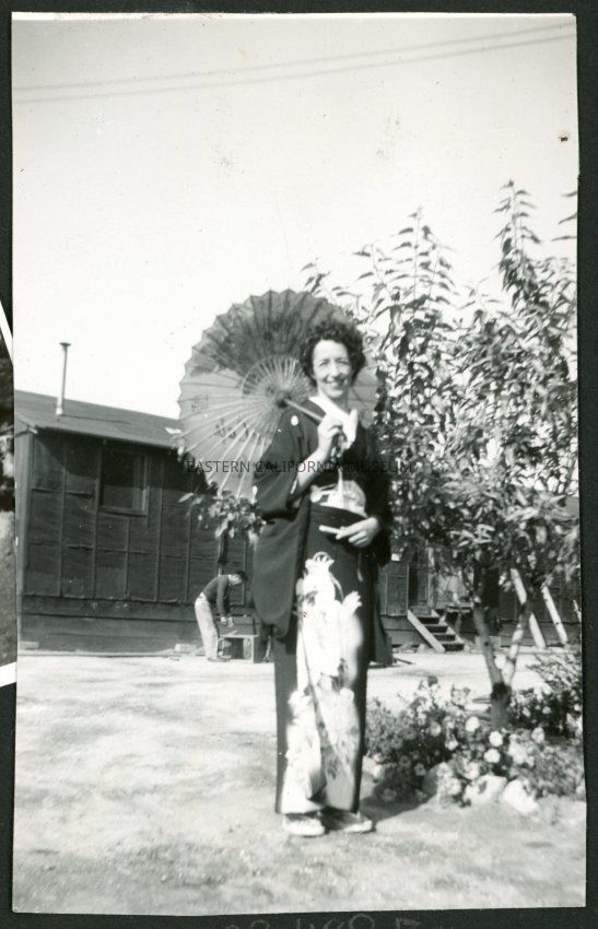 Photograph of Thelma McBride, full-length, facing slightly away from the camera, holding a parasol over her right shoulder. The photographer has stepped further away for this photograph. A Manzanar hospital building can be seen in the background with a man stading over a large bucket.Collection