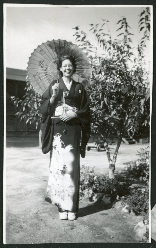Photograph of Dagmar Quarnstrom, full-length, facing slightly away from the camera, holding a parasol over her right shoulder. A Manzanar hospital building can be seen in the background.Collection