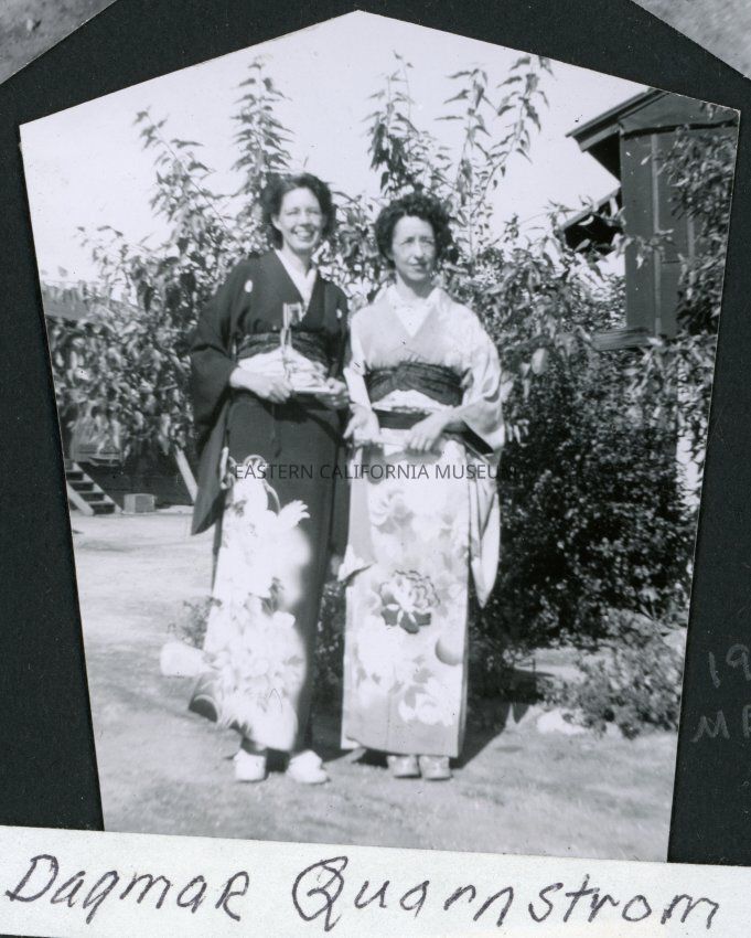 Photograph of Dagmar Quarnstrom and Thelma McBride, full-length, facing the camera with hands held in front. The corner of a Manzanar hospital building can be seen in the background.Collection