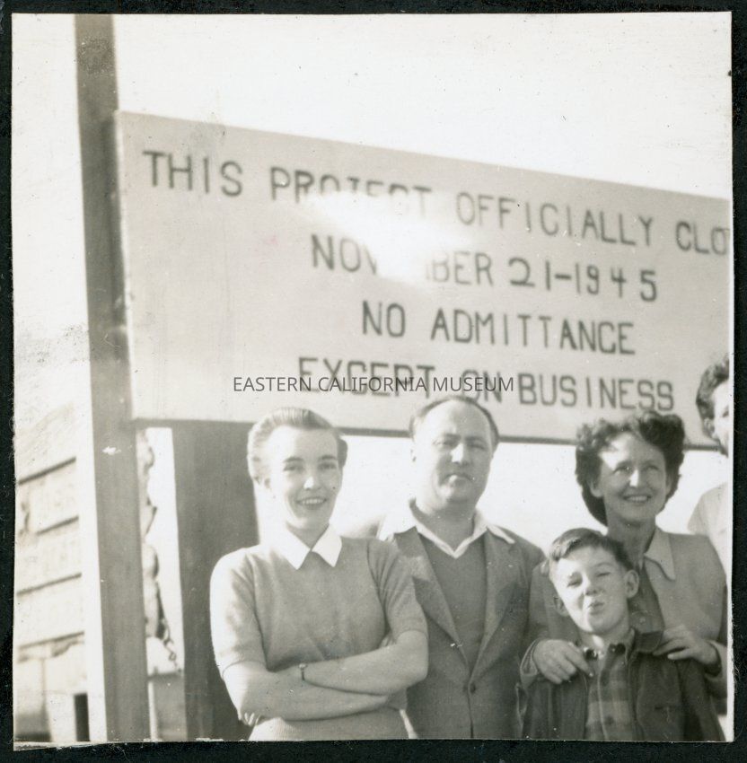 Photograph of Bea White and son, with Lucille Bouche and Elizabeth Moxley at the closing of Manzanar Incarceration Camp. They are standing in front of the entrance to the camp with the closure notification.