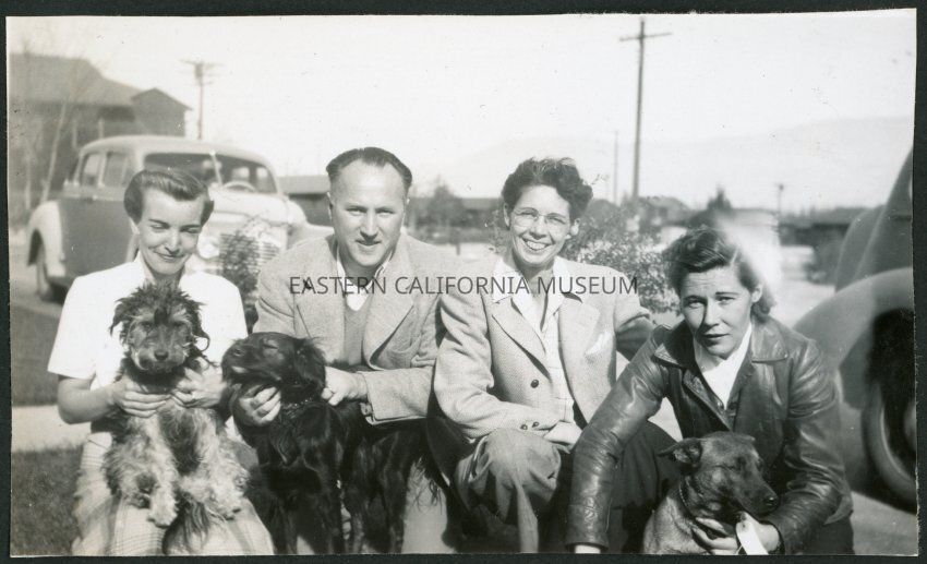 Photograph of four people with three dogs on a lawn at Manzanar Incarceration Camp. Behind them are two cars and several barracks buildings.Collection
