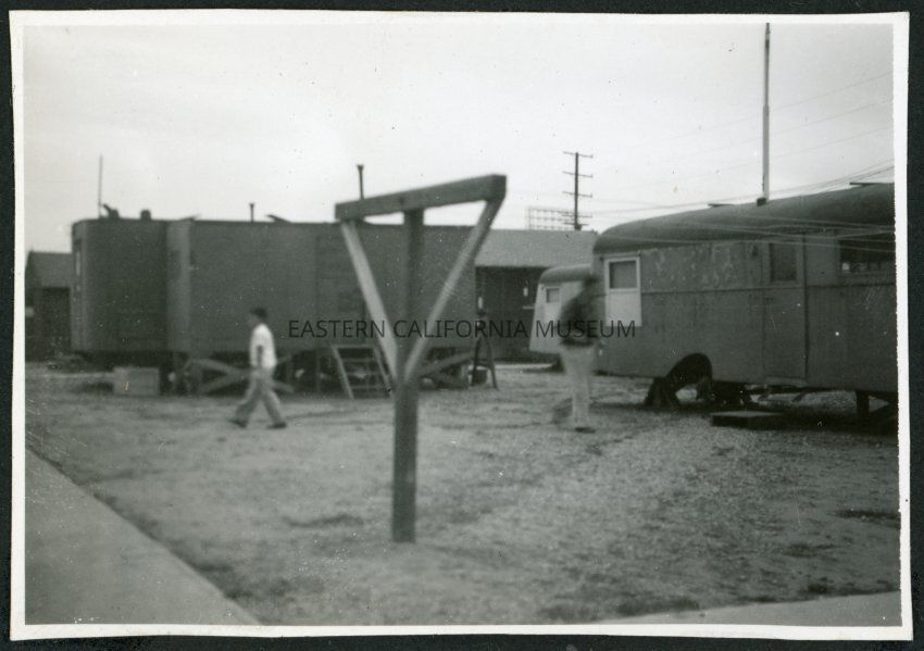 Photograph of a temporary structure and a large trailer in front of barracks at Manzanar Incarceration Camp. Two men are walking between the structures. In the foreground there is a clothes pole. The photograph is slightly out of focus.Collection