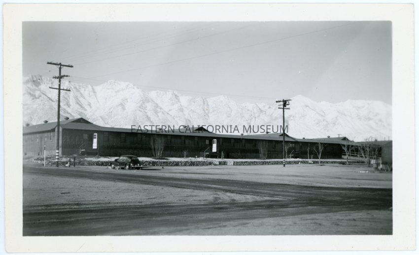 Photograph of the hospital at Manzanar Incarceration Camp taken from across the street with a vehicle parked in front. The snow-covered Sierra Nevada are visible in the background.