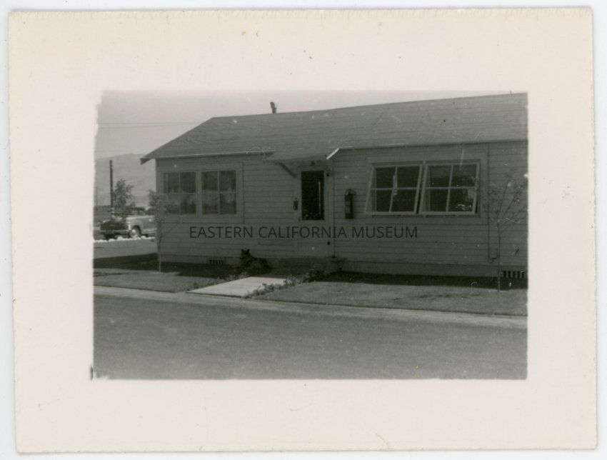 Photograph of staff housing at Manzanar Incarceration Camp. A dog is visible resting in the shade of the house. In the background a car and mountains are partially visible.
