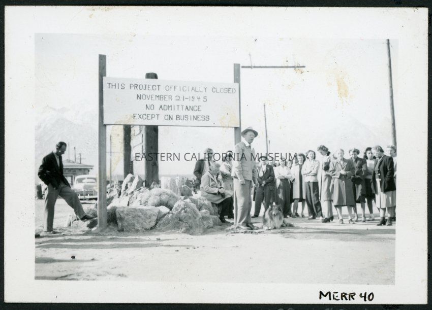 Description taken from original photo album, "Manzanar is now officially closed. Mr. Merritt addressing the staff that gathered at the gates of Manzanar to witness the departure of the last evacuee from the Center. November 21, 1945". This photograph includes his dog Sandy laying at his feet.