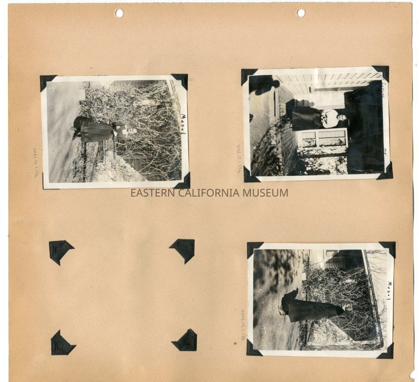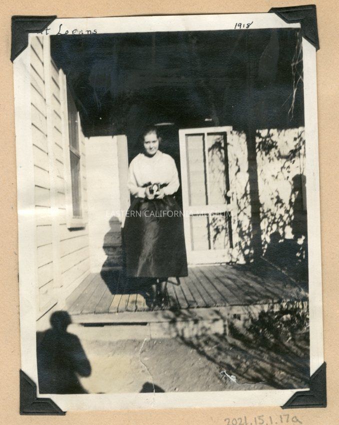 Photo of a young woman standing on the porch of a house. It is labled, "At Leeans 1918." She may be holding something at waist level--a camera? The shadow of the photographer is visible in the lower left corner.Collection