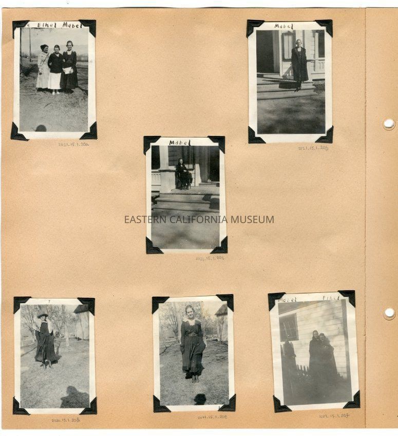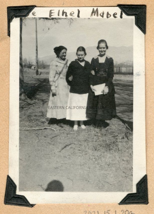Photo of three young ladies standing outside. The girl on the right is holding something hite and rectangular in her hands. They are identified from left to right as Babe, Ethel, and Mabel.Collection