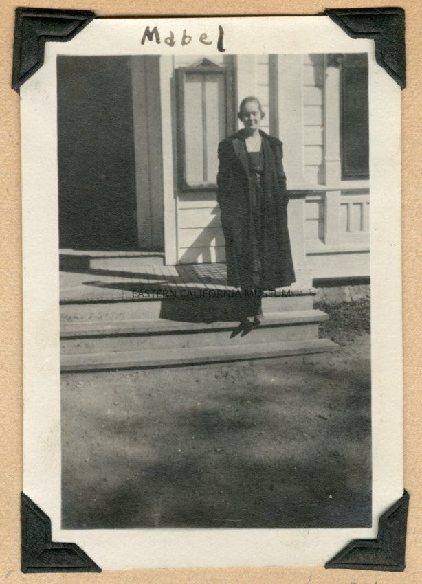 Photo of a young woman standing on the steps in front of what might be either the courthouse or a church. She is identified as Mabel.