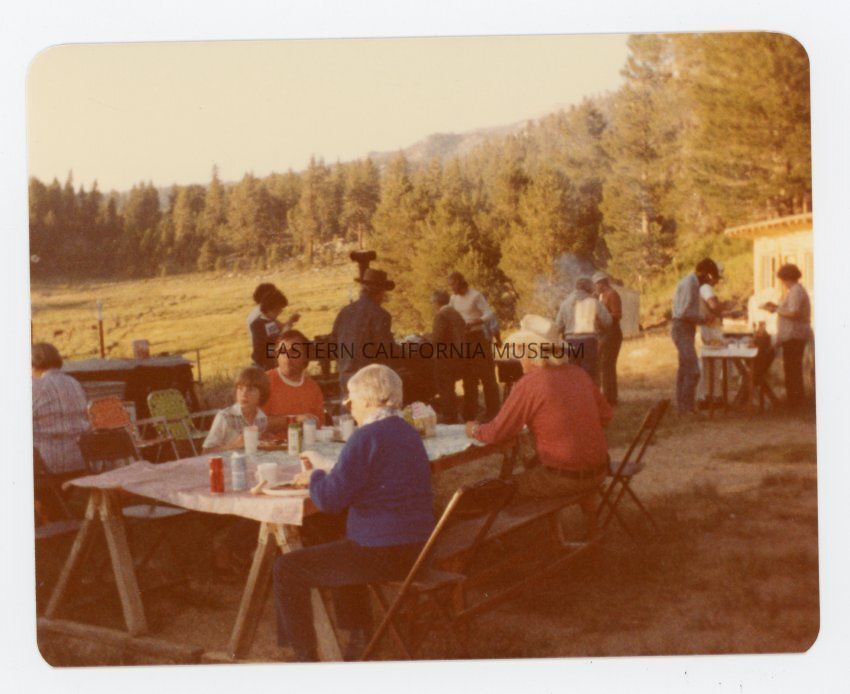 Color photo of a group of people eating outside at picnic tables. Likely Monache Meadow in August 1980.