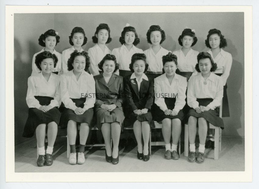 Black and white photograph of the Roughnecks, taken at Manzanar War Relocation Center, 1943. Left to right 2nd row: Amy Araki, Seiko Kato, Sumi Osajima, Alice Kakoi, Yasie Kitagawa, Kumiko Kato, Ruby Nakagawa. Left to right 1st row: Kyoko Kama, Kiyoko Tanabe, Advisors Aki Sakamoto and Grace Muruki, Miho Yoshimura, Aiko Miyake [uncertain ID]. Coaches, not shown, were Shiro Nomura and Martin Hochi.Photograph Details