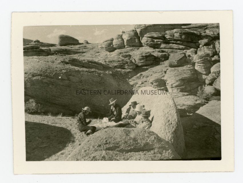 Photo of five people sitting in the Alabama Hills having a picnic.