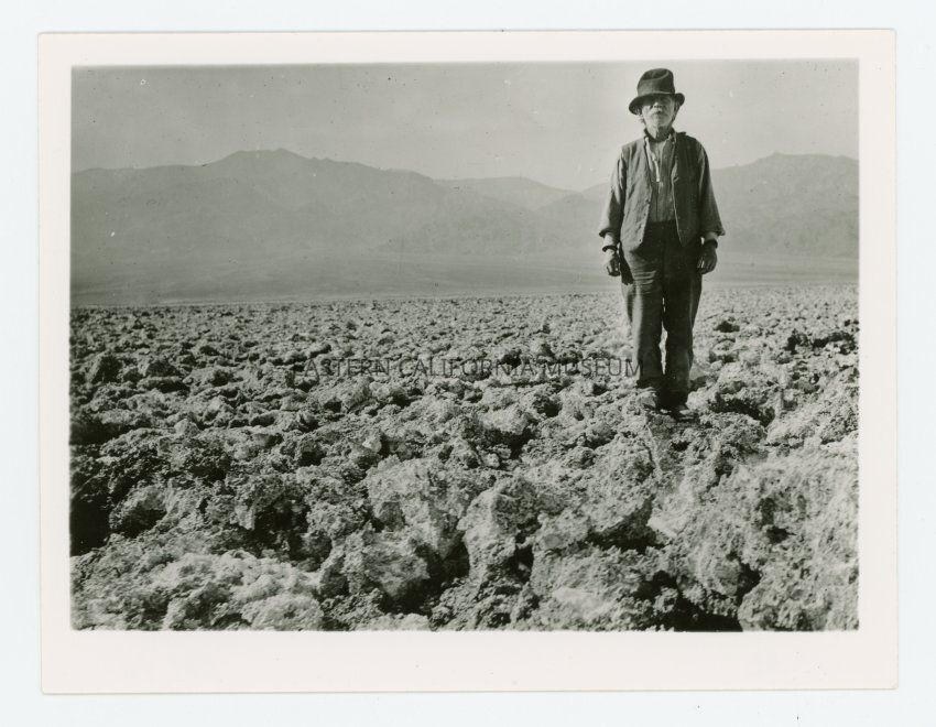 Photo of Shorty Harris, old-time prospector, standing in the the desert in Death Valley.