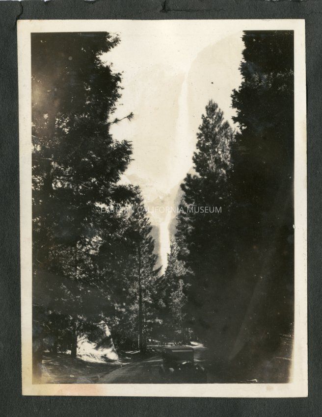 Photo of what appears to be Yosemite Falls with a vehicle on a dirt road in the foreground.Collection
