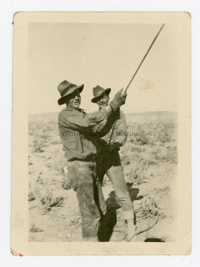 Photo of two men pulling on a cable. They are likely LADWP employees constructing power lines.