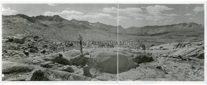 There are some pack horses in the center distance and a sign post. Smooth bulders and lake also in image.