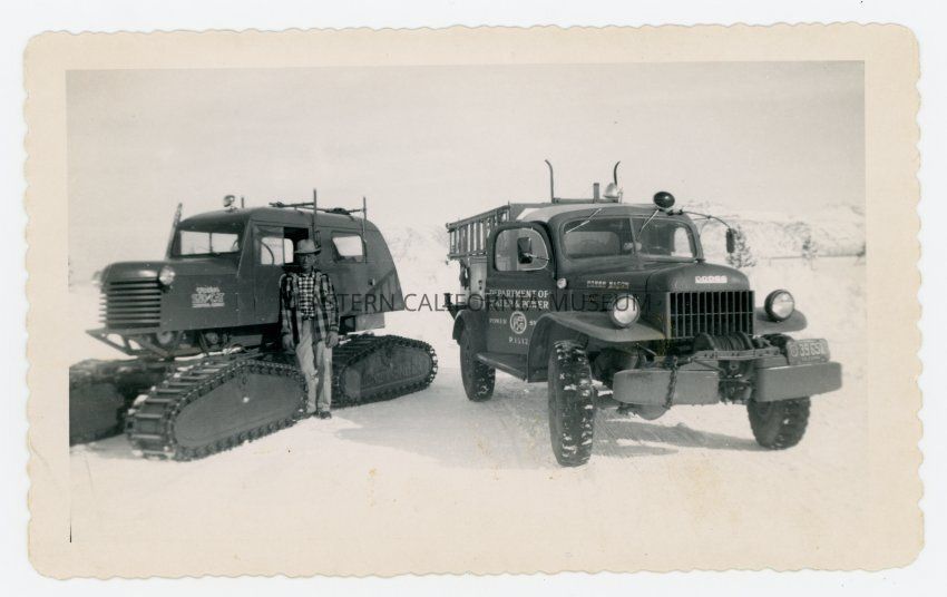 Photo of LADWP snow removal equipment (a Dodge Power Wagon truck and a Sno-Cat with tracks). There is a man standing next to the sno-cat, and he may be Walter Irving Moore.Collection