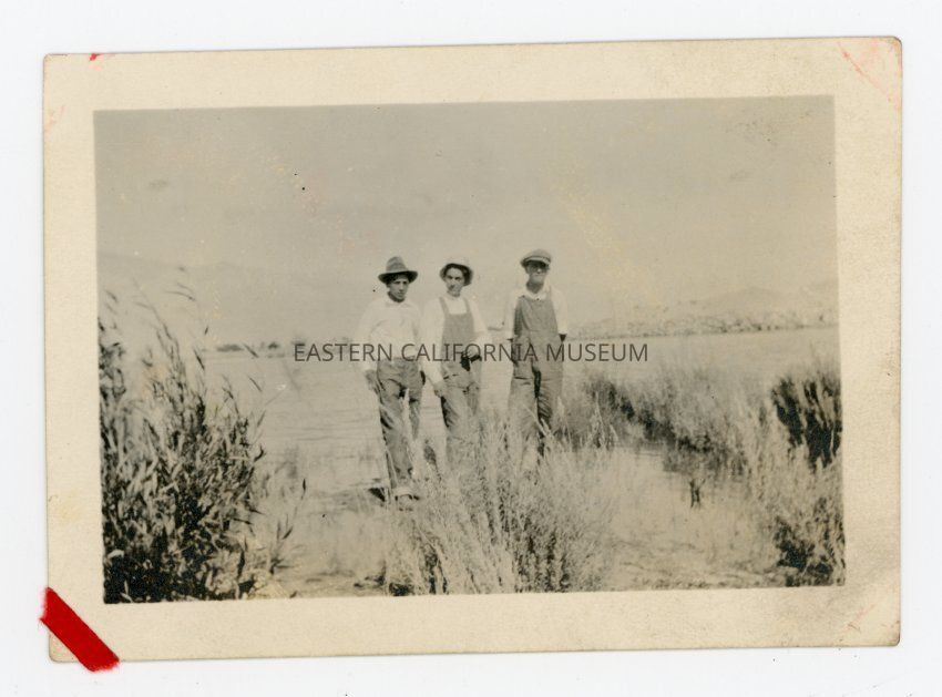 Photo of three people standing by a lake (maybe Diaz Lake?).