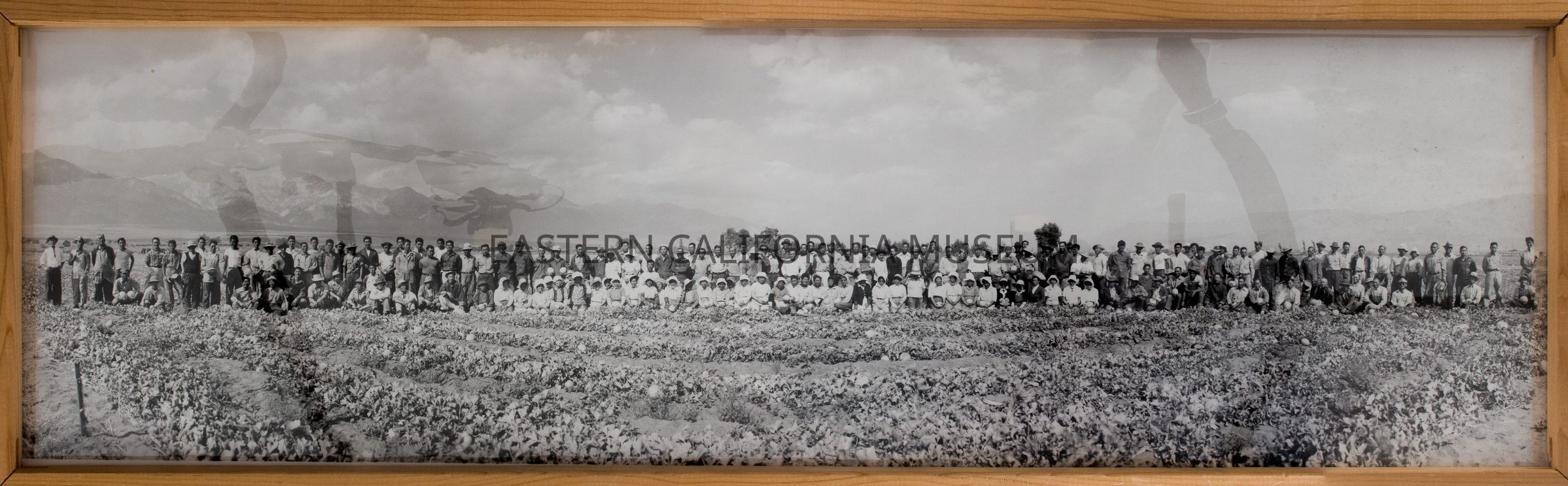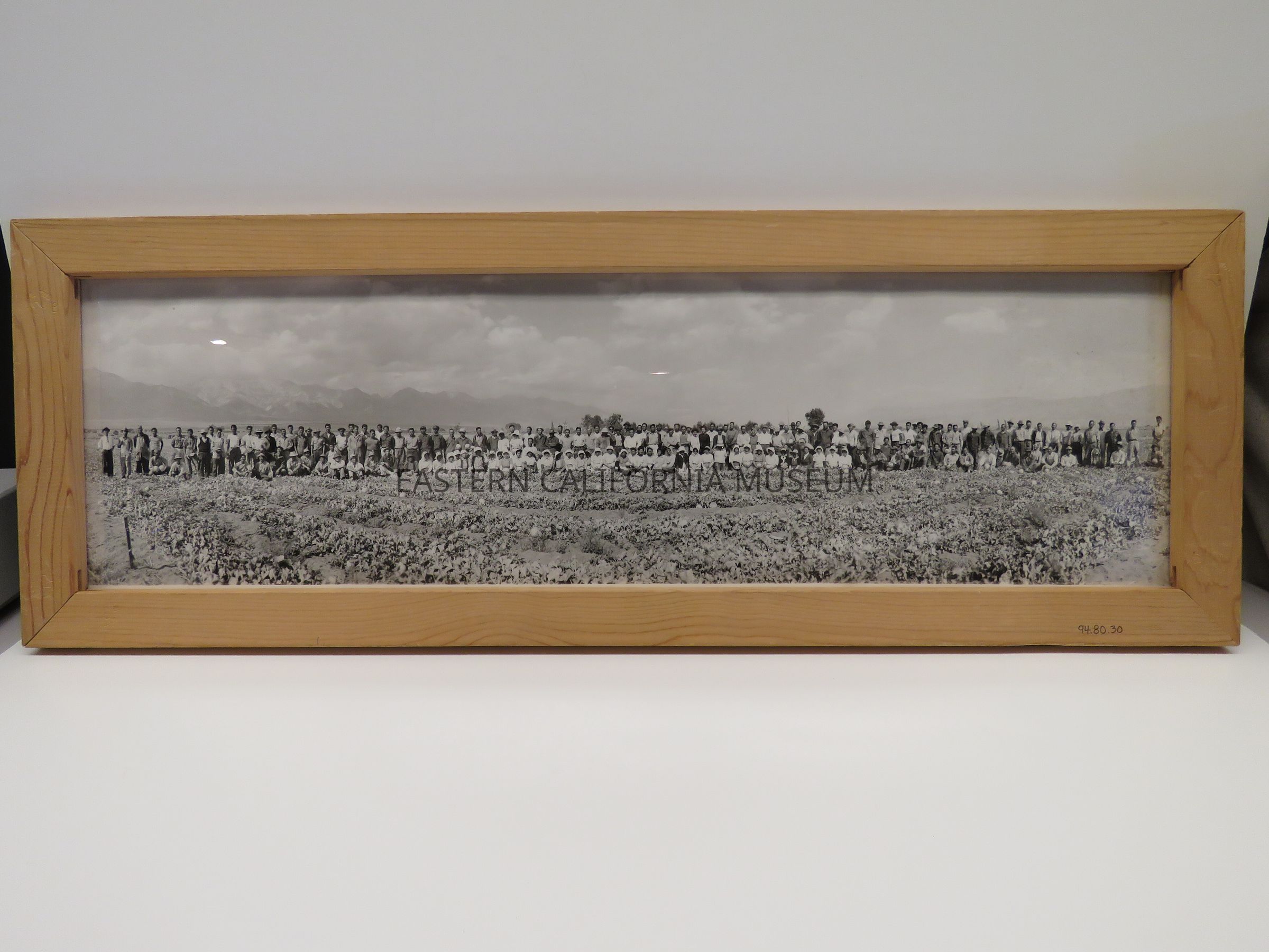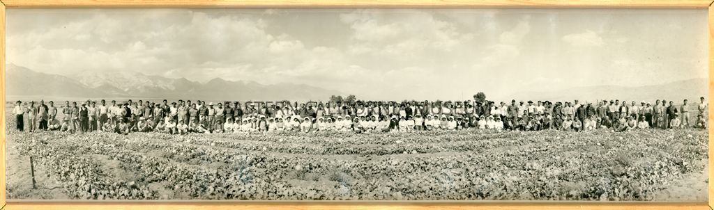 Framed exterior panoramic black and white photograph of estimated 180 men and women in 2 rows in an agricultural field with Sierra Nevada mountain range behind them. They are identified in the accession paperwork as farm workers. Several of the people are holding large melons of some type, and the rows of crops in front of the people also contain melons. A guard tower is visible in the background.