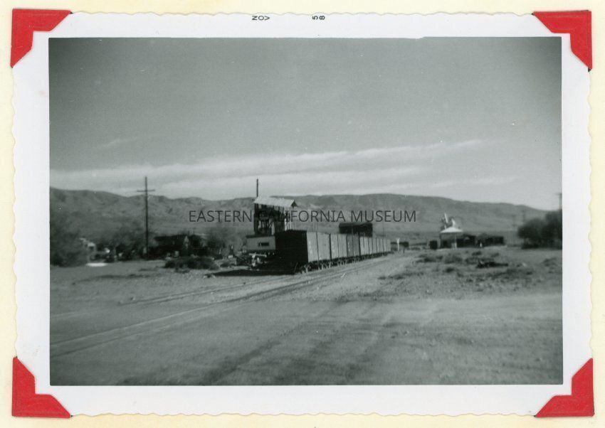 Photo taken looking south from the Keeler railroad station down the tracks at a line of boxcars. Photo taken in 1958 by C. Krautter.