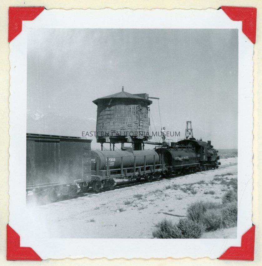 Photo of Southern Pacific engine #9 filling up at the Kearsarge station water tank. Photo taken on 05/30/1956 by W. P. Payne.