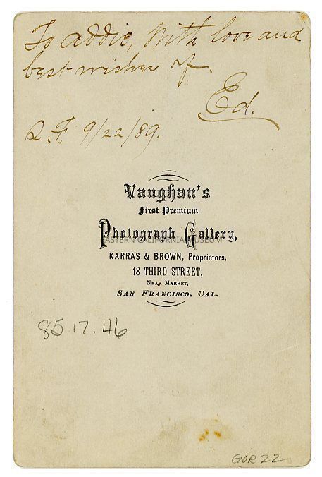 Mounted photograph of a man with a muttonchops. Photographer was Vaughan's Photograph Galley of San Francisco.