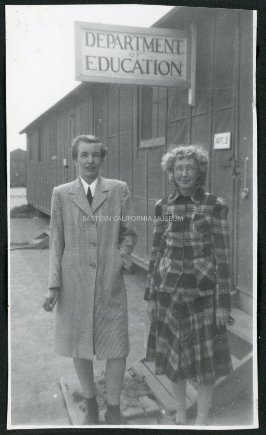 Photograph of Lucille Smith Bouche and another standing in front of the Department of Education office at Manzanar Incarceration Camp. The sign next to the door reads, "Apt. 3". A chain and a lock is hanging on the door and there are wooden steps with a doormat in front.Collection