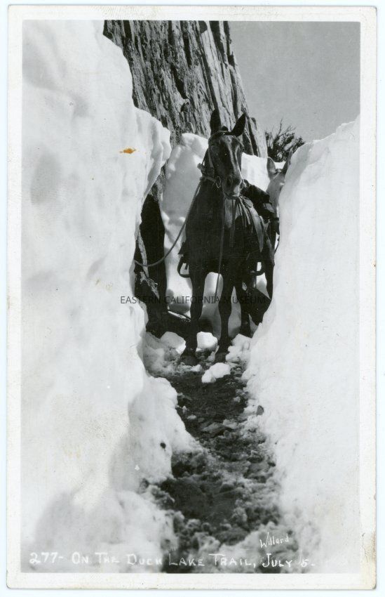 "277 - On the Duck Lake Trail, July 5-, Willard" Photograph of a mule on the trail surrounded by high snow on both sides