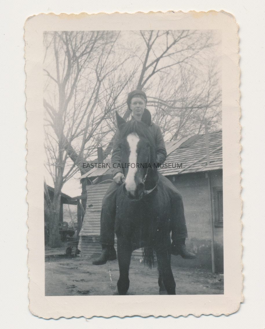Photo of Marvin Donald Smith on horseback. There is a building in the background and Marvin appears to be a teenager.