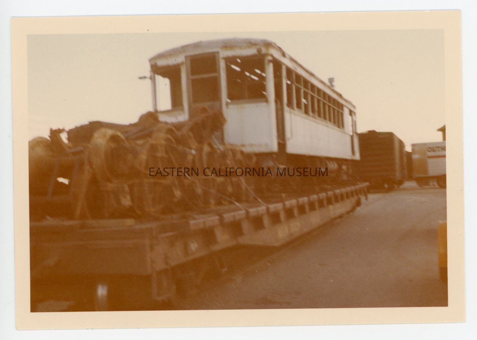 1972.61.3--Color photo of a white train car loaded on a flatbed car. There are additional train tracks to the right and equipment to the left.