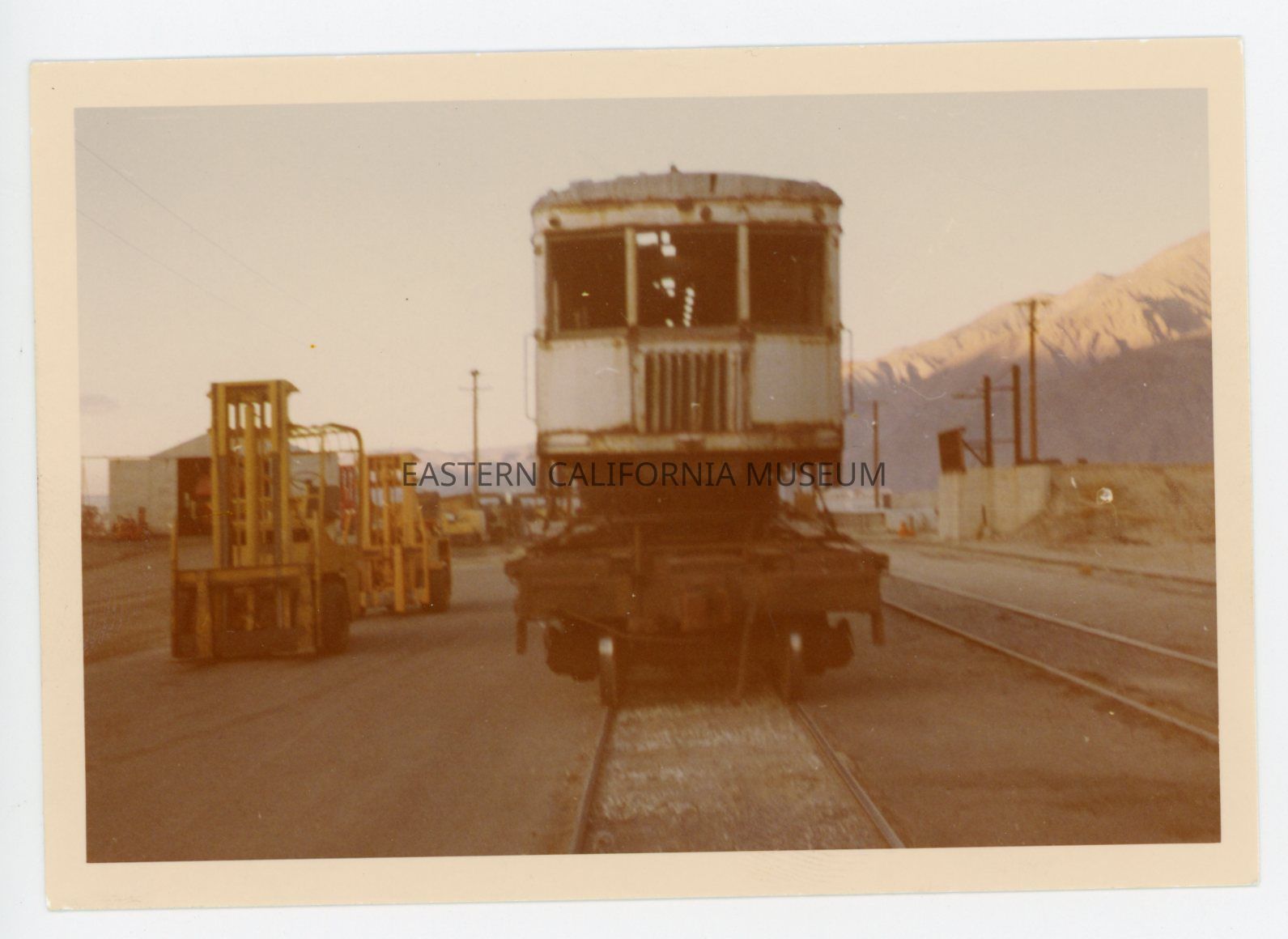 Written in pencil on reverse: N. Inyo Mountains, Lone Pine Station, SPRR Stand. Ga. [standard gauge] freight cars, Death Valley R.R. "Galop. Goose" (or Motorized Unit Car) (on way to Laws).
