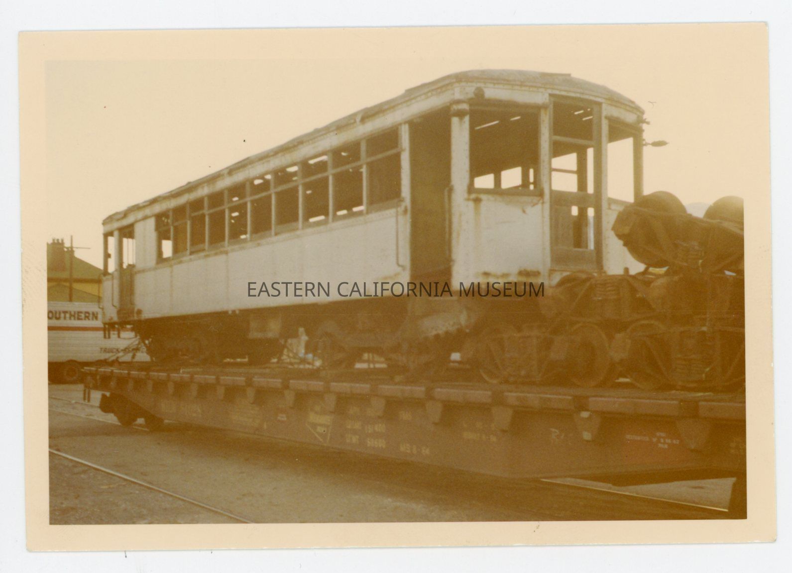 1972.61.4--Color photo of a white train car with lots of windows (passenger car?) loaded on a flatbed car. There appears to be a pile of wheelsets on the flatbed as well.