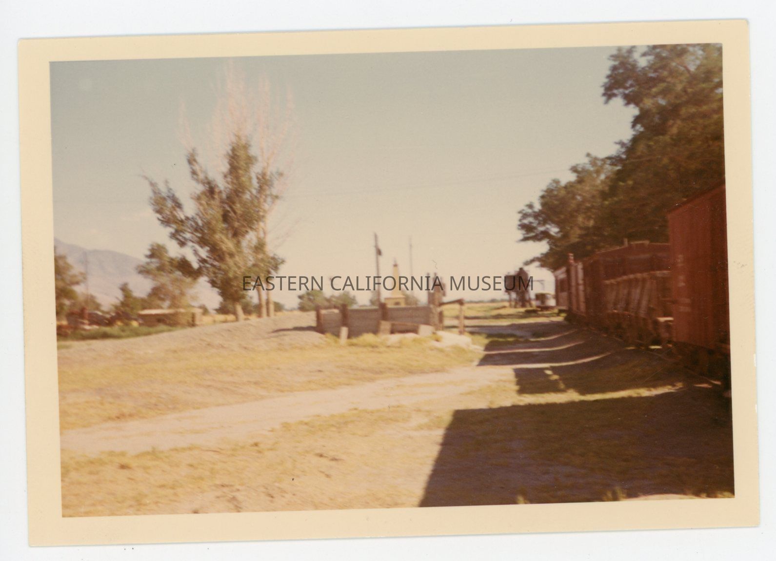 1972.61.5--Color photo of the grounds at Laws Museum. There is a line of red boxcars to the right and a water tower in the distance.