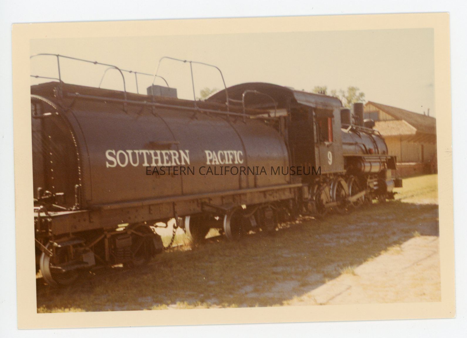 1972.61.6--Color photo of Southern Pacific engine #9 at Laws. The station depot building is in the background.