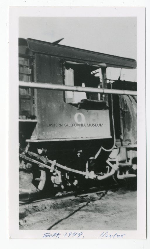 Photo of the cab of Southern Pacific Engine #9. It is labeled on the front in blue ink "Sept. 1949 Keeler."